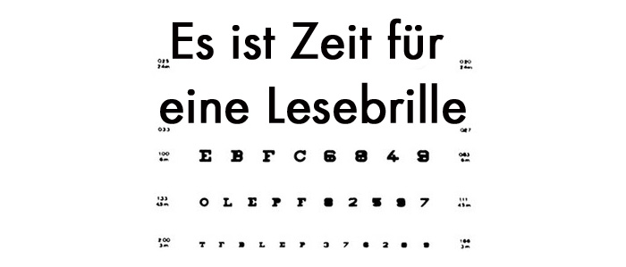 Die Presbyopie auch Alterssichtigkeit genannt, zeigt sich wenn Ihnen die Buchstaben der Zeitung immer kleiner vorkommen, Ihnen das Leselicht zu schwach erscheint oder wenn Sie das Kleingedruckte einfach nicht mehr entziffern können. Dann ist es Zeit für eine Lesebrille.